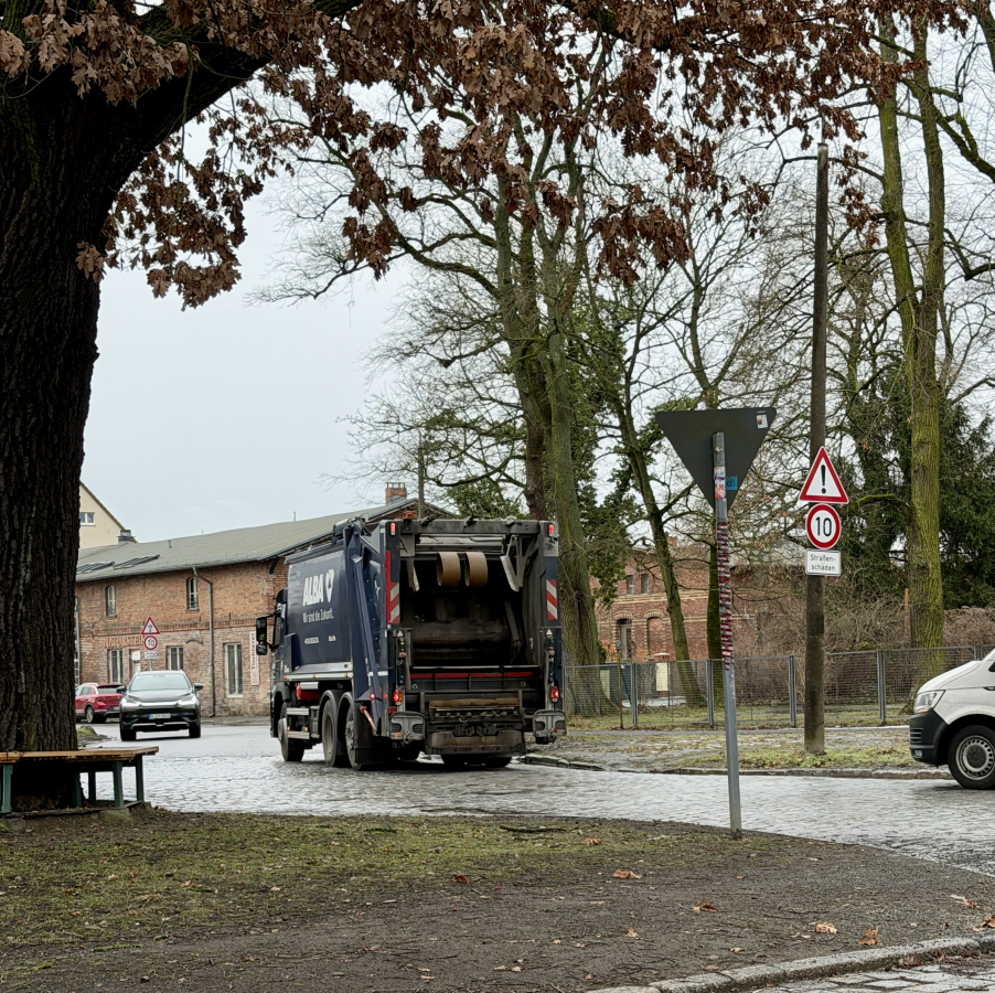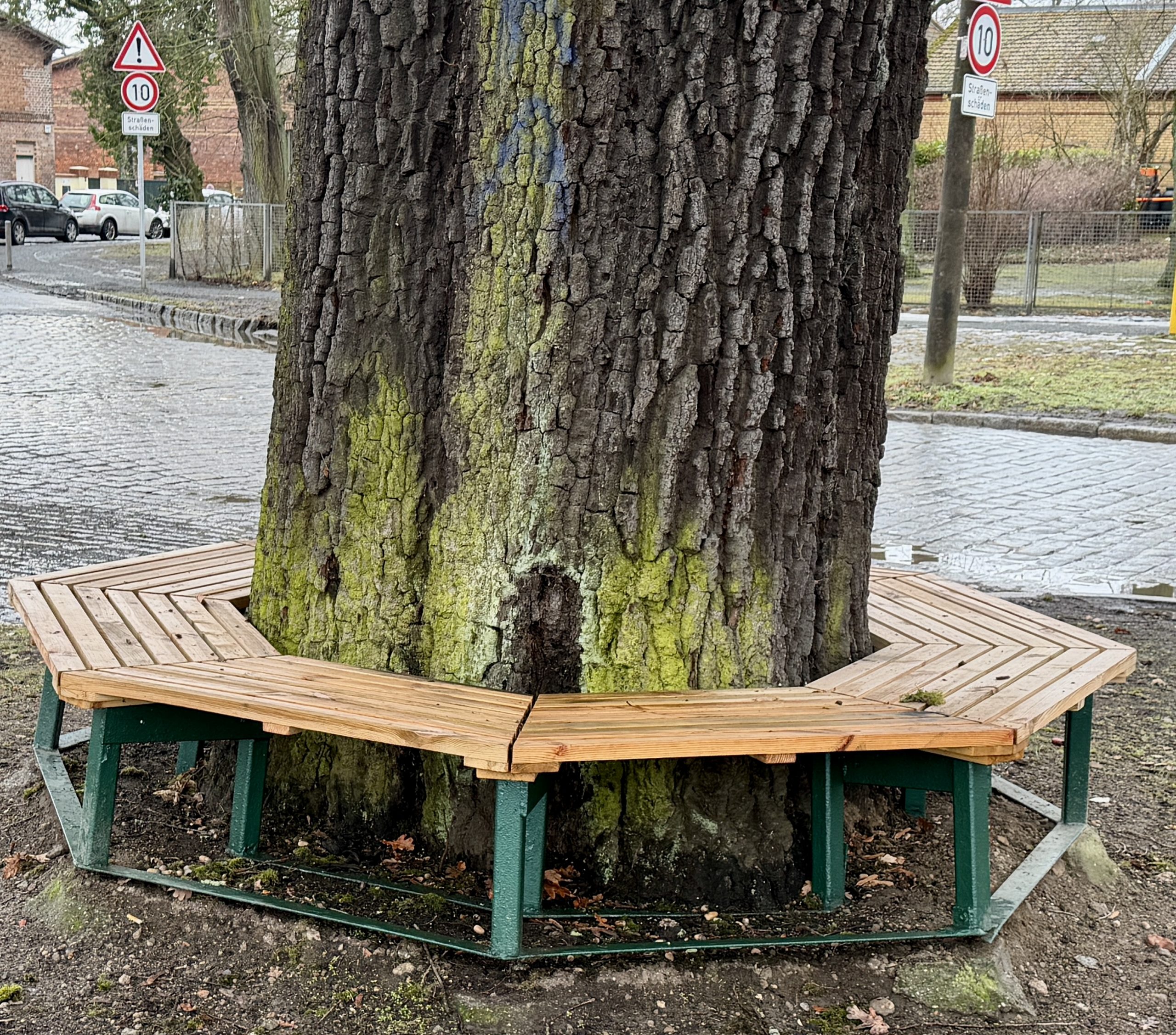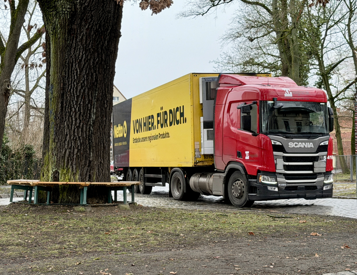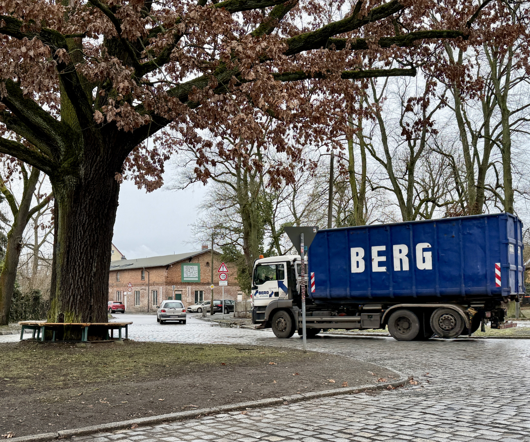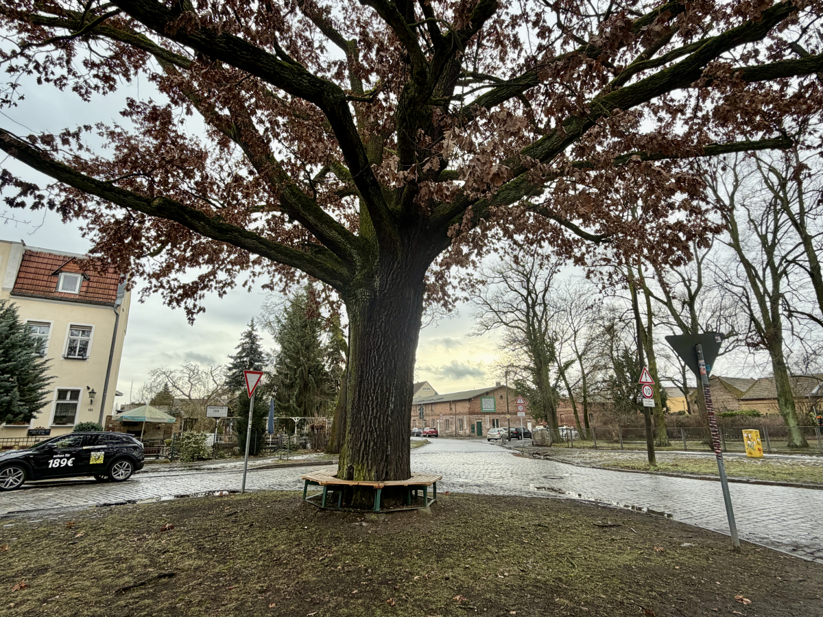Sie könnte ein schöner Treffpunkt im Dorf sein – wenn nicht täglich durchschnittlich mehr als 1,200 Schwerlastfahrzeuge und über 3,500 Autos die Bank an der Dorfeiche Richtung Schönhauser Straße (oder zurück) passieren würden (s. aktuelle Telraam-Verkehrszählung); die Fahrzeuge während der Nacht und Richtung Mönchmühler Straße sind dabei noch nicht einmal mitgezählt.